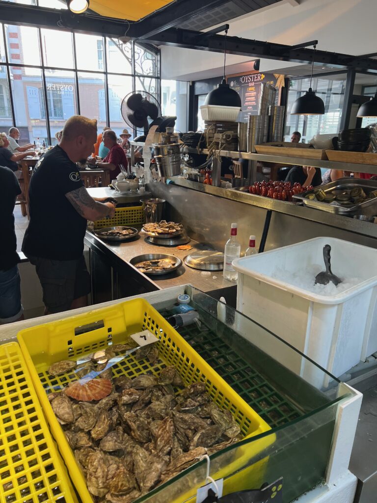 Es ist heute Mittwoch, der Markt ist sehr gut besucht, viele Menschen sitzen in der Sonne, essen Austern und trinken Wein.