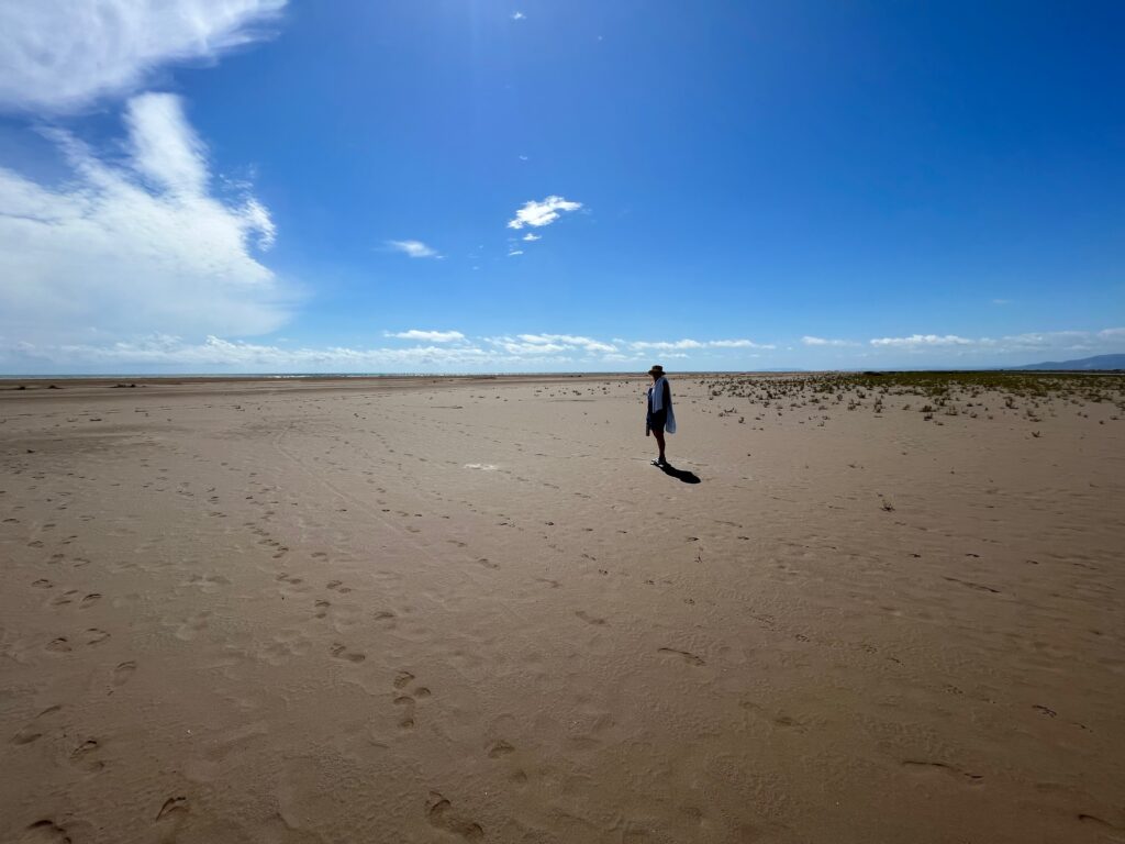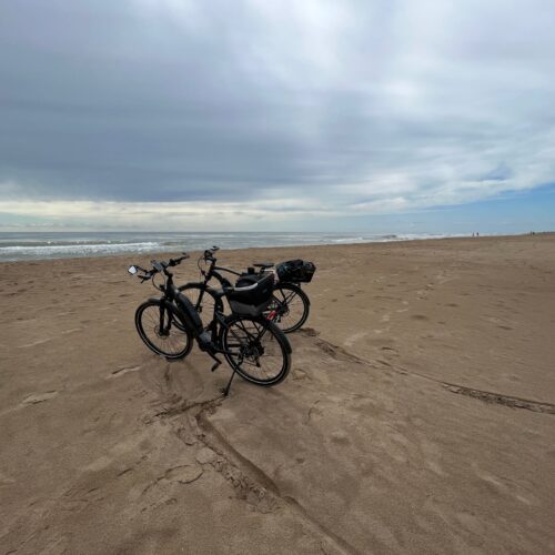 Mit den Fahrrädern machen wir uns auf den Weg zum Playa del Trabucador. Es handelt sich dabei um einen schmalen Sandstrandpiste die auch von PKW´s und LKW´s befahren werden kann. Leider hat es am Vortag und in der Nacht geregnet, daher ist der Sand sehr weich und es stehen riesige Wassersehen auf der Piste. Auf halben Weg Torres de l´Ebre sehen wir um.