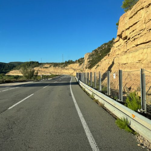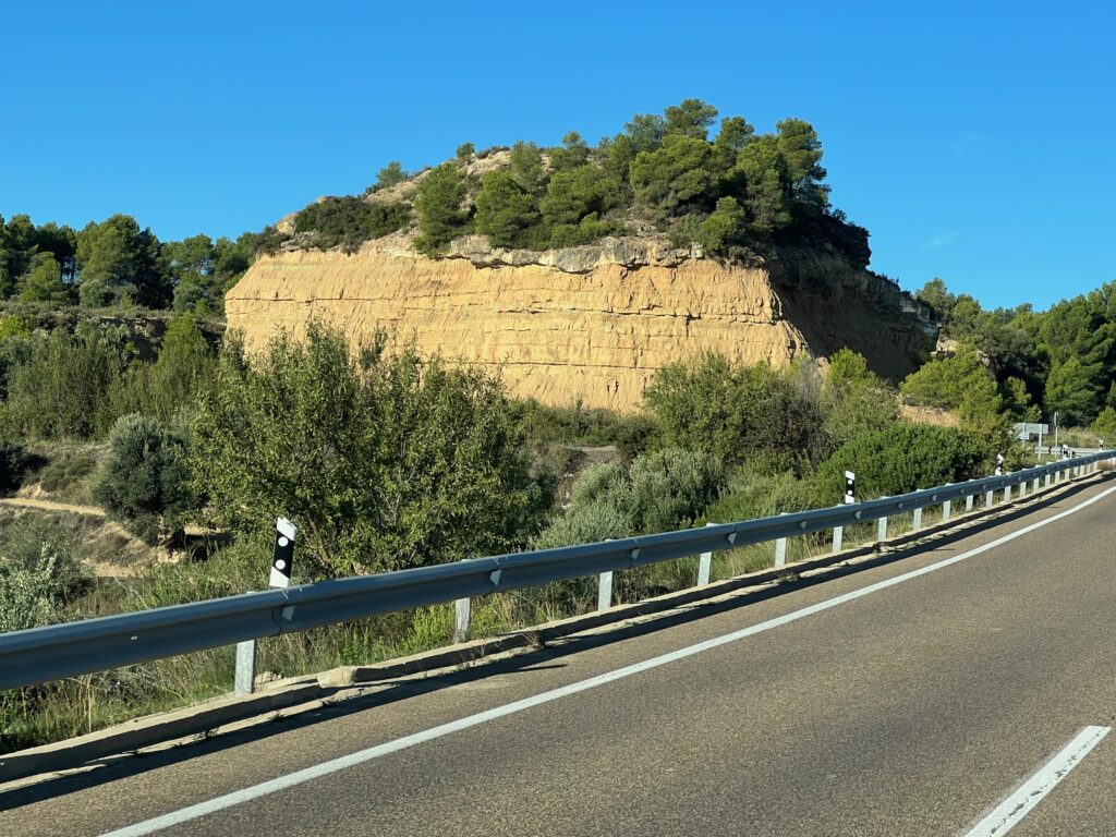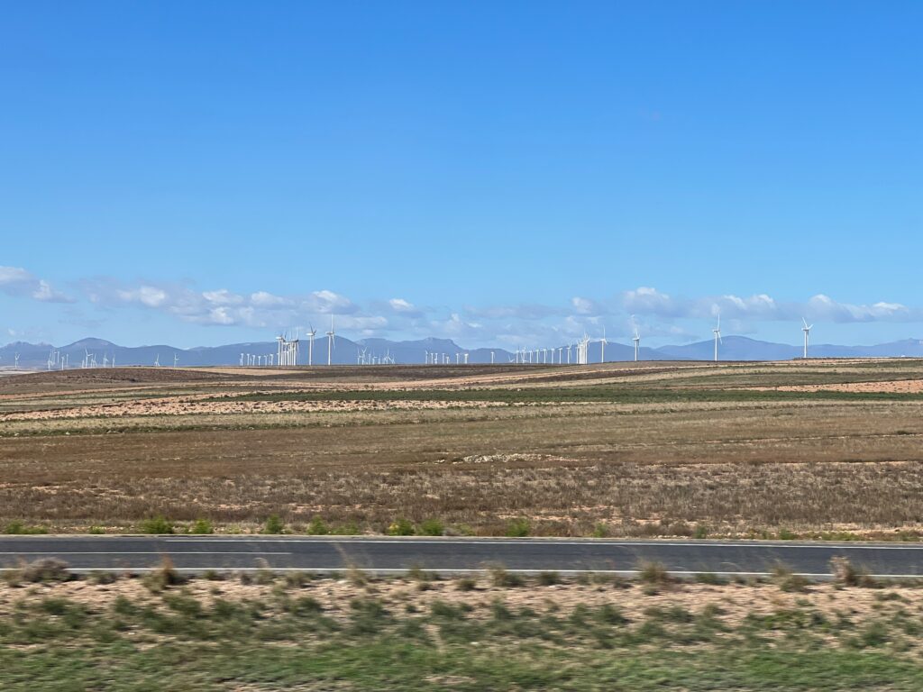 Die Fahrt führt uns über die Landstraße durch wirklich sehr schöne Täler und Schluchten, gesäumt von Orangen und Zitronenplantagen, auch Wein und später Olivenhaine. Als es dann Richtung Saragossa geht verändert sich die Landschaft in eine trockenen karge Ebene. Dort stehen Windräder soweit das Auge reicht, sicher mehrerer Tausend, ebenso eine Vielzahl an PV- Anlagen.